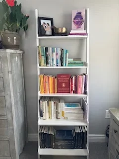 I looked at a few feet of blank wall in our master bedroom with new eyes. I knew it held the potential for the solution I was looking for. I ordered a white, ladder shaped shelf, to offer bright contrast against my colorful books and to preserve a spaciousness in my room. I love the influence that books on display can offer when intentionally designed. Color coordinated per usual, this open air furniture was the right touch to regularly comfort me in my time of shape shifting.
